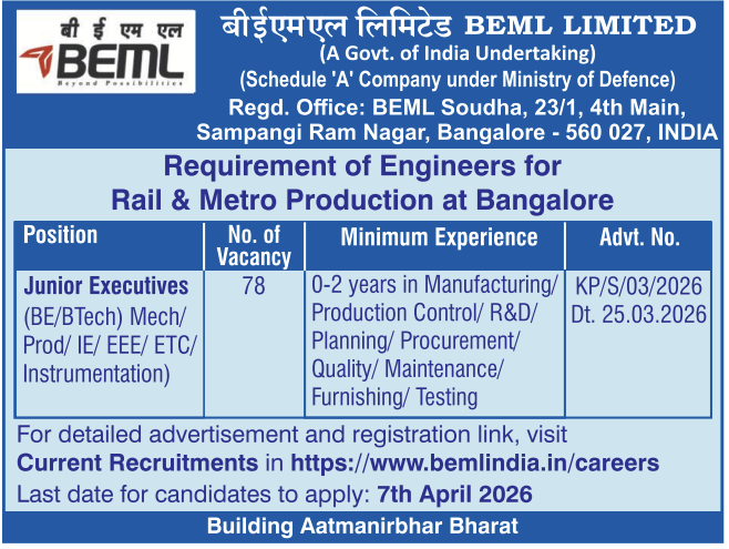 BEML Junior Executive Recruitment 2026 : Bharat Earth Movers Limited (BEML) has issued a notification for the recruitment of Junior Executives at its Bengaluru-based Rail and Metro manufacturing unit for the year 2026. This recruitment drive offers a total of 78 vacancies across various engineering disciplines (for candidates holding a B.Tech/ B.E degree). The advertisement, bearing No. KP/S/03/2026, was released on March 25, 2026. Online applications will close on April 7, 2026. The detailed advertisement and the online registration link are expected to become active shortly on BEML’s official website bemlindia.in.